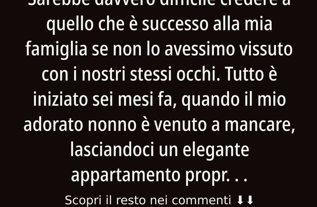 Sarebbe davvero difficile credere a quello che è successo alla mia famiglia se non lo avessimo vissuto con i nostri stessi occhi. Tutto è iniziato sei mesi fa, quando il mio adorato nonno è venuto a mancare, lasciandoci un elegante appartamento proprio nel cuore di Firenze. Dopo circa un mese dal suo funerale, io e la mia famiglia ci siamo messi daccordo per pulire lappartamento e prepararlo per la vendita. Durante la giornata, abbiamo riempito grandi sacchi con tutte le sue cose, mentre la zia continuava a lamentarsi che buttare i vecchi libri è un sacrilegio!tipico.