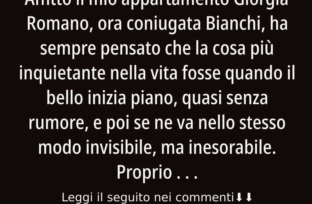 Giorgia Romano, ora coniugata Bianchi, ha sempre pensato che la cosa più inquietante nella vita fosse quando il bello inizia piano, quasi senza rumore, e poi se ne va nello stesso modo invisibile, ma inesorabile. Proprio come succede coi gerani sul davanzale: li innaffi, li guardi, sembrano vivi. Poi, tutto dun tratto, una sera noti le foglie ingiallite ed è già troppo tardi.