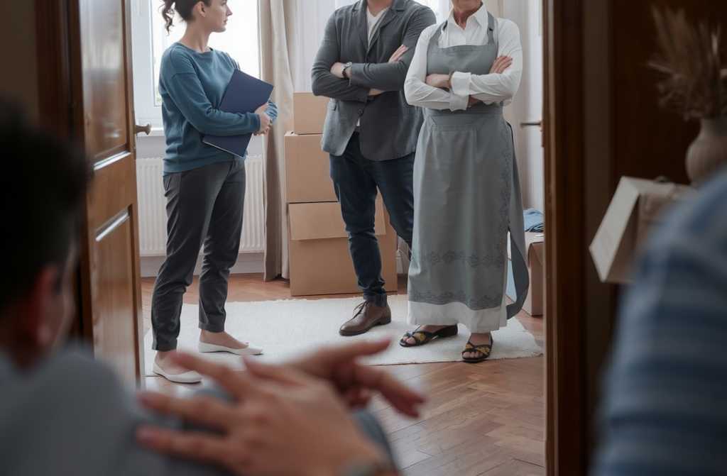Il rumore si fermò. La suocera apparve sulla soglia della cucina: una donna robusta, dignitosa, cinquantasette anni, con un grembiule sopra un completo grigio chiaro. Capelli ben raccolti, guanti nelle mani. Espressione seria, quasi solenne.