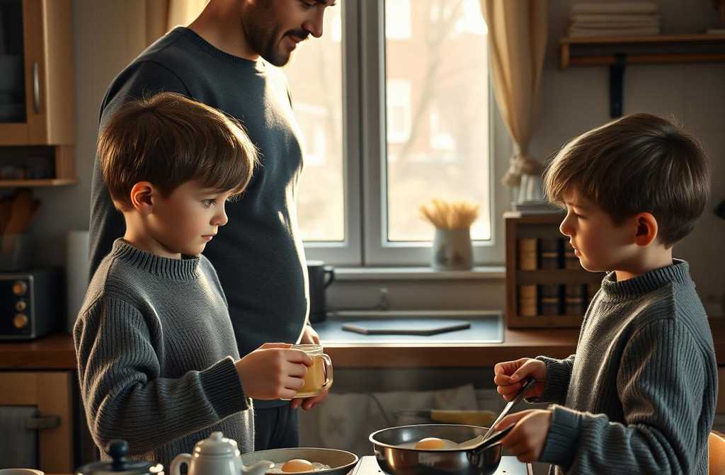 In cucina, laria era fresca come sempre al mattino. Guardò il termometro fuori dalla finestra: meno cinque. Un buon inverno, secco. Peccato solo che non nevicasse. Fuori, una signora anziana del secondo piano spazzava il cortile. Gli sembrò che parlasse da sola? I “ragazzi” irruppero nella stanza. Il maggiore, quello nato cinque minuti prima, si mise a preparare il tè. Il minore prese la padellatocca a lui fare colazione per tutti oggi.