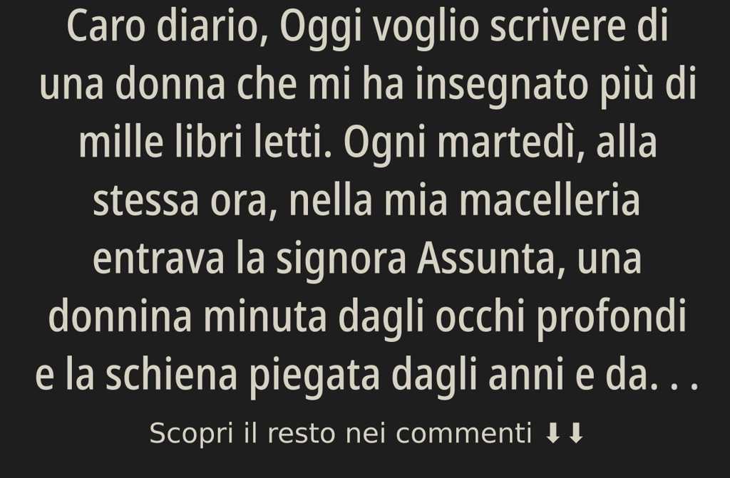 Oggi voglio scrivere di una donna che mi ha insegnato più di mille libri letti. Ogni martedì, alla stessa ora, nella mia macelleria entrava la signora Assunta, una donnina minuta dagli occhi profondi e la schiena piegata dagli anni e dalla fatica. Non faceva mai storie, non si lamentava, non chiedeva più del necessario: semplicemente si fermava davanti al banco e fissava la carne esposta, come se contasse desideri, non solo bistecche.