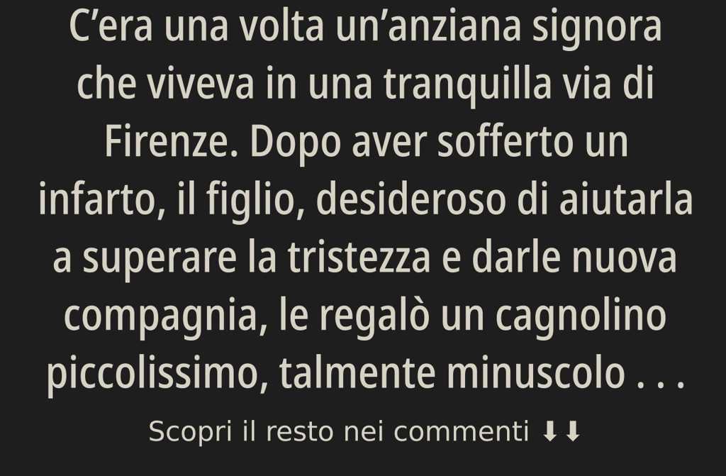 Cera una volta unanziana signora che viveva in una tranquilla via di Firenze. Dopo aver sofferto un infarto, il figlio, desideroso di aiutarla a superare la tristezza e darle nuova compagnia, le regalò un cagnolino piccolissimo, talmente minuscolo che sembrava quasi un topolino. La chiamò Filomena. Questo piccolo batuffolo di pelo divenne la luce nei giorni della signora, che piano piano tornò a sorridere.