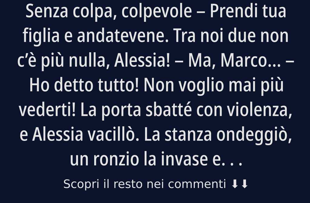 Marco, ti ho già detto tutto! lo interruppe, guardandolo con tale intensità che lui fece un passo indietro. Tu hai creduto subito alle cattiverie. Senza domande, senza spiegazioni, hai infangato il mio amore e il nome di nostra figlia! Ti rendi conto? Non so perché Eleonora abbia inventato tutto questo, e non voglio saperlo! Il fatto è uno solo: tu hai creduto a lei. Vuoi il test del DNA? Facciamolo! Così non avrai più dubbi che la bambina con i tuoi occhi è davvero tua figlia!
