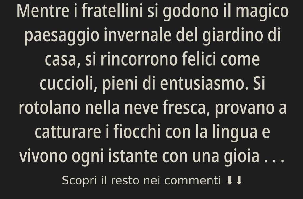 Mentre i fratellini si godono il magico paesaggio invernale del giardino di casa, si rincorrono felici come cuccioli, pieni di entusiasmo. Si rotolano nella neve fresca, provano a catturare i fiocchi con la lingua e vivono ogni istante con una gioia contagiosa che ti entra nel cuore.