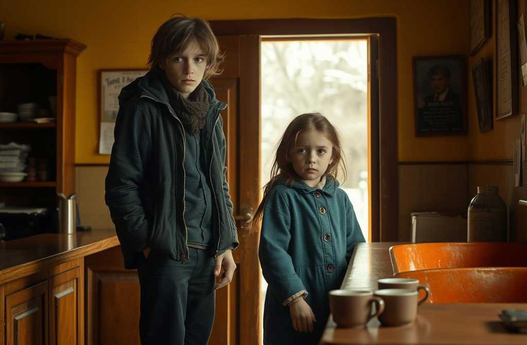 Il campanello sulla porta suonò. Un vento gelido entrò insieme a due figure: un ragazzo magro, con le guance scavate e le scarpe logore, che portava sulle spalle una bambina. I suoi capelli erano arruffati, il viso nascosto contro di lui, come per sfuggire al mondo.