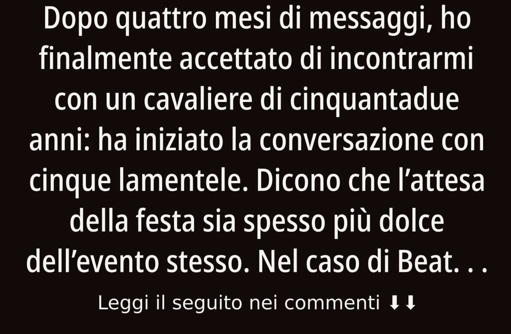 Beatrice aveva quarantacinque anni: quelletà in cui si va a un appuntamento non più con il batticuore, ma con lironia da esploratore. Vediamo che esemplare capita stavolta, pensava, preparandosi.