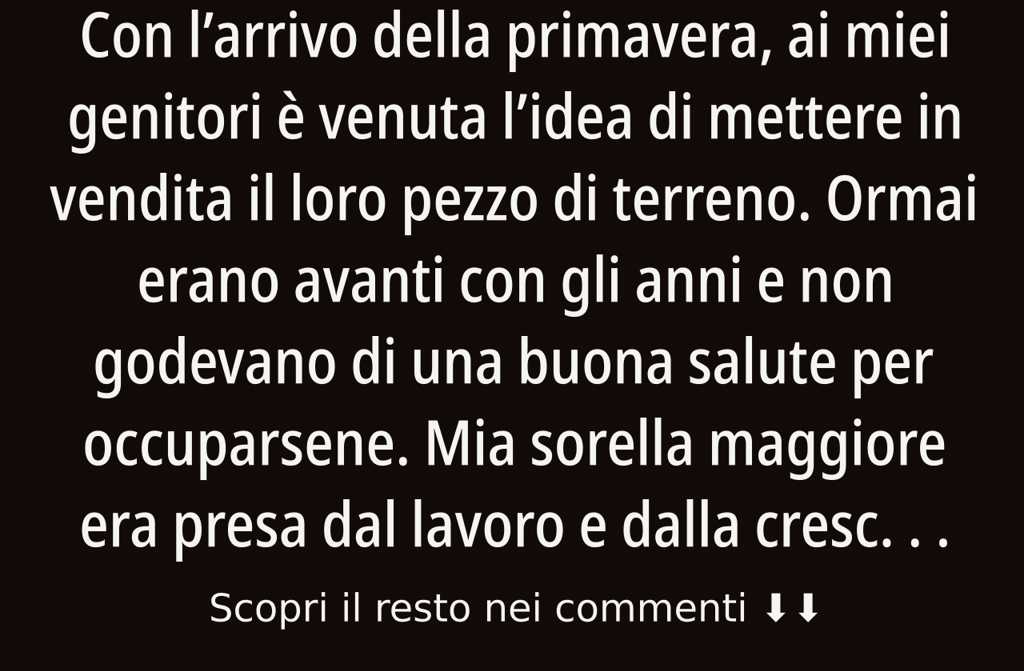 Con larrivo della primavera, ai miei genitori è venuta lidea di mettere in vendita il loro pezzo di terreno. Ormai erano avanti con gli anni e non godevano di una buona salute per occuparsene. Mia sorella maggiore era presa dal lavoro e dalla crescita dei suoi figli, e non riusciva a trovare il tempo per aiutare. Ci hanno pensato a lungo, finché hanno preso una decisione.