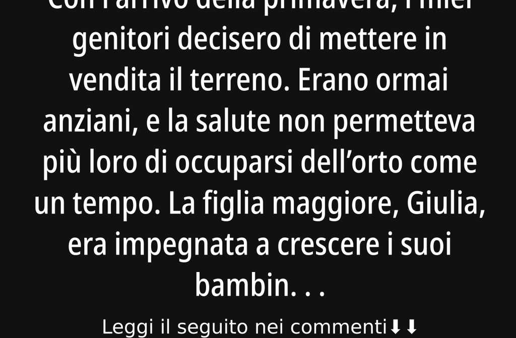Con l’arrivo della primavera, i miei genitori decisero di mettere in vendita il terreno. Erano ormai anziani, e la salute non permetteva più loro di occuparsi dellorto come un tempo. La figlia maggiore, Giulia, era impegnata a crescere i suoi bambini e a lavorare, e non trovava mai il tempo per dare una mano. Dopo tante riflessioni, alla fine i miei genitori presero la decisione.