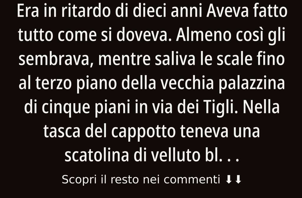 Aveva fatto tutto come si doveva. Almeno così gli sembrava, mentre saliva le scale fino al terzo piano della vecchia palazzina di cinque piani in via dei Tigli. Nella tasca del cappotto teneva una scatolina di velluto blu scuro, comprata poche ore prima alla gioielleria Stella dOro. Carlo continuava a toccarla con le dita, come se potesse sparire da un momento allaltro. Lanello era costoso, ci aveva messo quasi unora a sceglierlo: la commessa era tornata almeno cinque volte con diversi vassoi. Lui osservava, valutava, pensava a come si sarebbe illuminato il volto di Martina. Doveva essere felice. Dieci anni non sono uno scherzo.