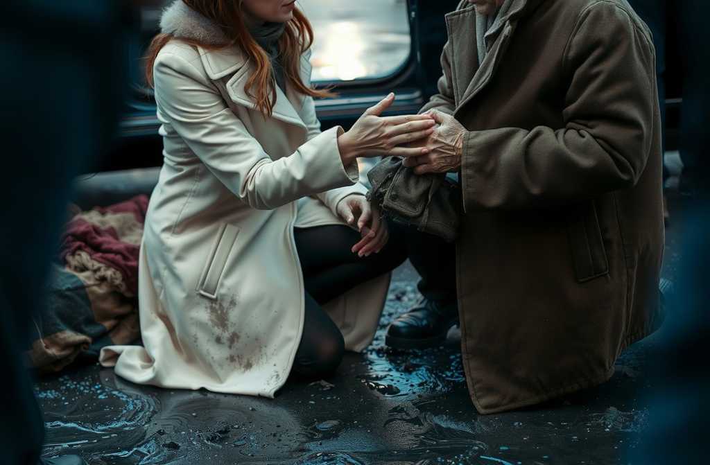 Questa scena lascia i passanti senza parole. Una lussuosa berlina nera si ferma lentamente vicino a un marciapiede di Roma, proprio dove un senzatetto si stringe in un mucchio di coperte logore per difendersi dal freddo. La portiera si apre e una donna scende con passo deciso. Indossa un cappotto bianco immacolato che sembra essere costato una fortuna.
