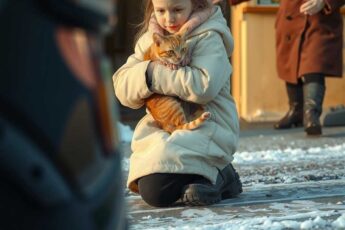 La donna non solo si avvicina al clochard: si inginocchia davanti a lui, direttamente in una pozzanghera sporca. Non sembra preoccuparsi minimamente per il suo abito costoso. Nelle mani tiene un sacchetto pieno di fragranti cornetti appena sfornati.