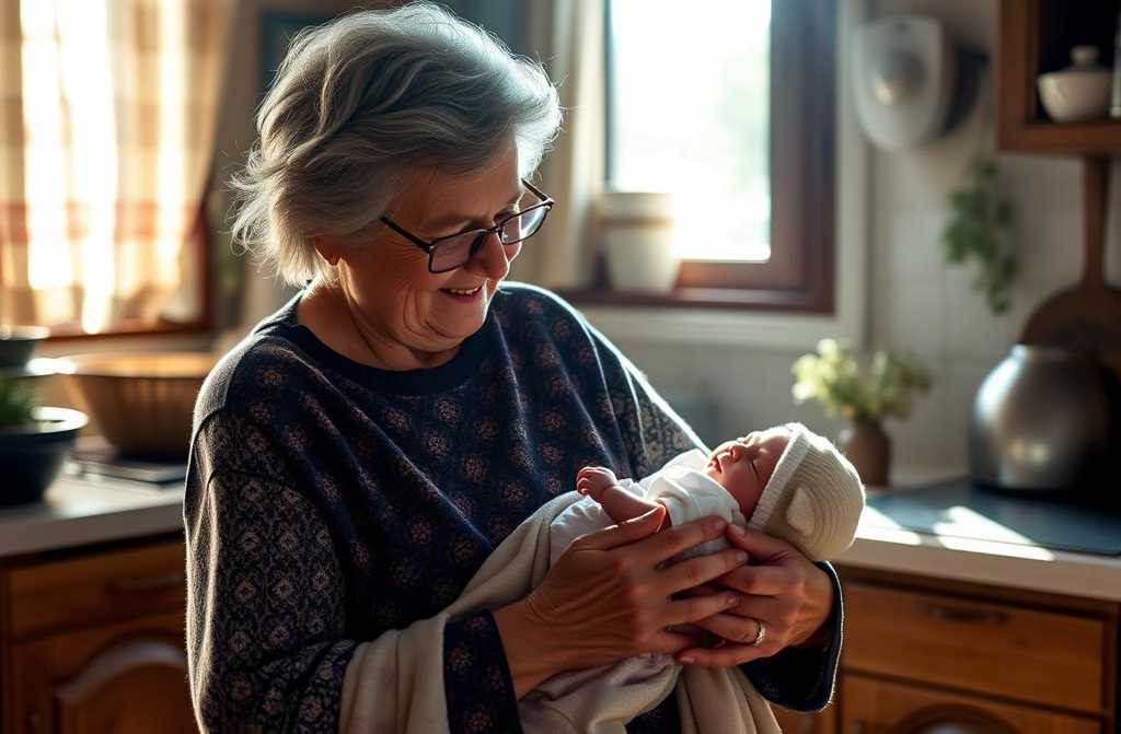 La suocera prende il nipote e lo culla con un gesto teatrale.