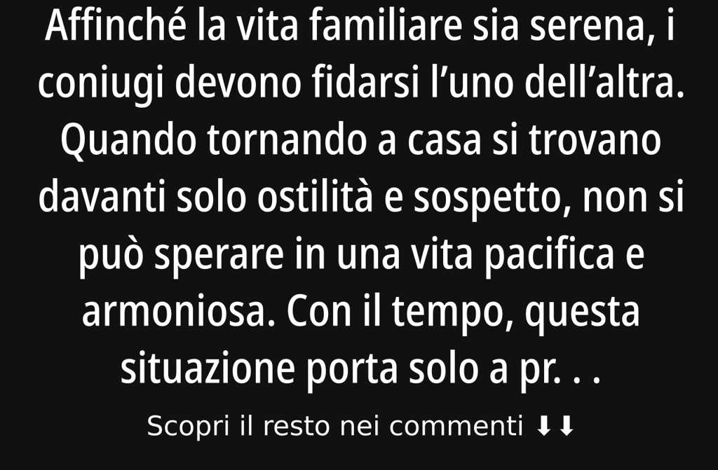 Affinché la vita familiare sia serena, i coniugi devono fidarsi luno dellaltra. Quando tornando a casa si trovano davanti solo ostilità e sospetto, non si può sperare in una vita pacifica e armoniosa. Con il tempo, questa situazione porta solo a problemi e finisce per rovinare i rapporti tra persone care.