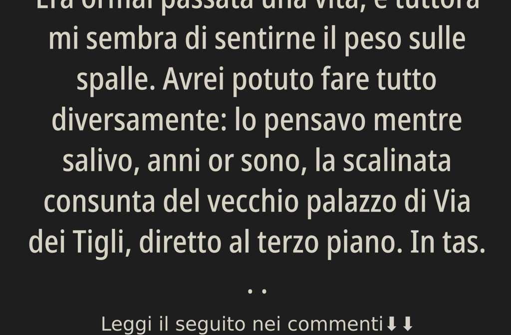 Silenzio. Poi, sottovoce: «Perché ti amavo. Speravo tu cambiassi. Faceva male lasciare tutto anche se capivo che non bastava. La gente aspetta, Giulio, aspetta anche quando non serve più.»
