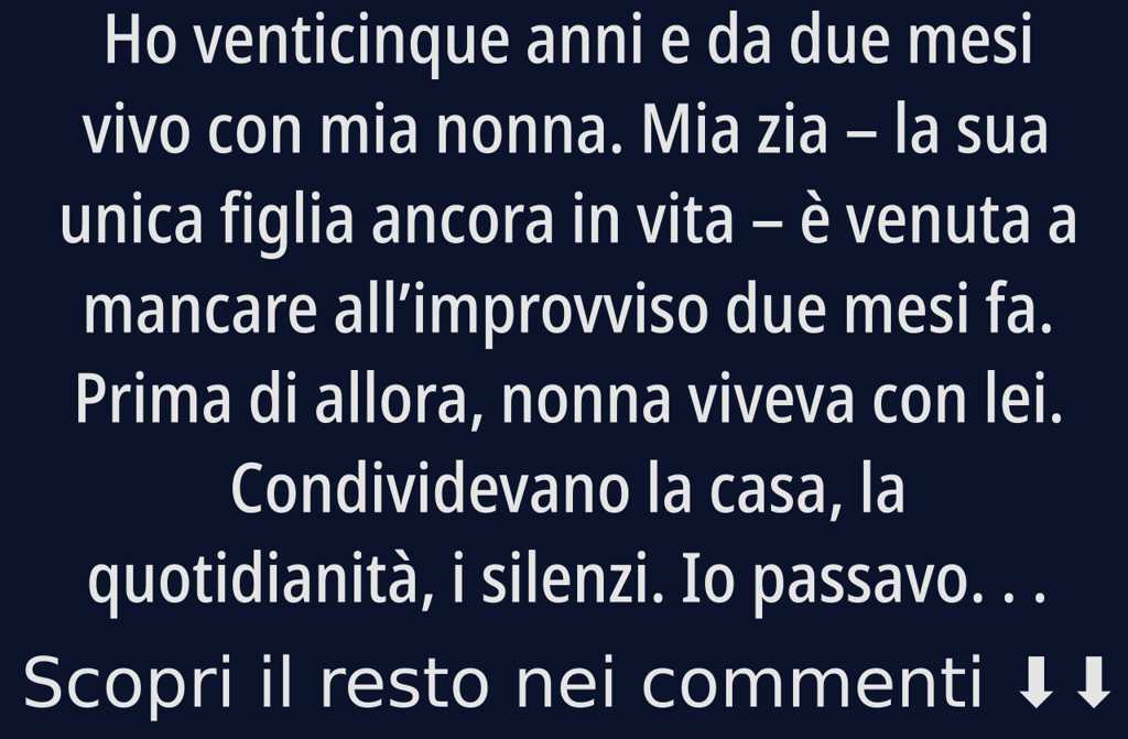 La perdita non mi è estranea. Mia madre è morta quando avevo diciannove anni. Da allora ho imparato a convivere con lassenza come fosse qualcosa di normale. Non ho mai conosciuto mio padre. Non ci sono storie nascoste, né misteri: semplicemente non cera. Così, quando se nè andata anche mia zia, mi è stato chiaro: siamo rimaste solo io e nonna.