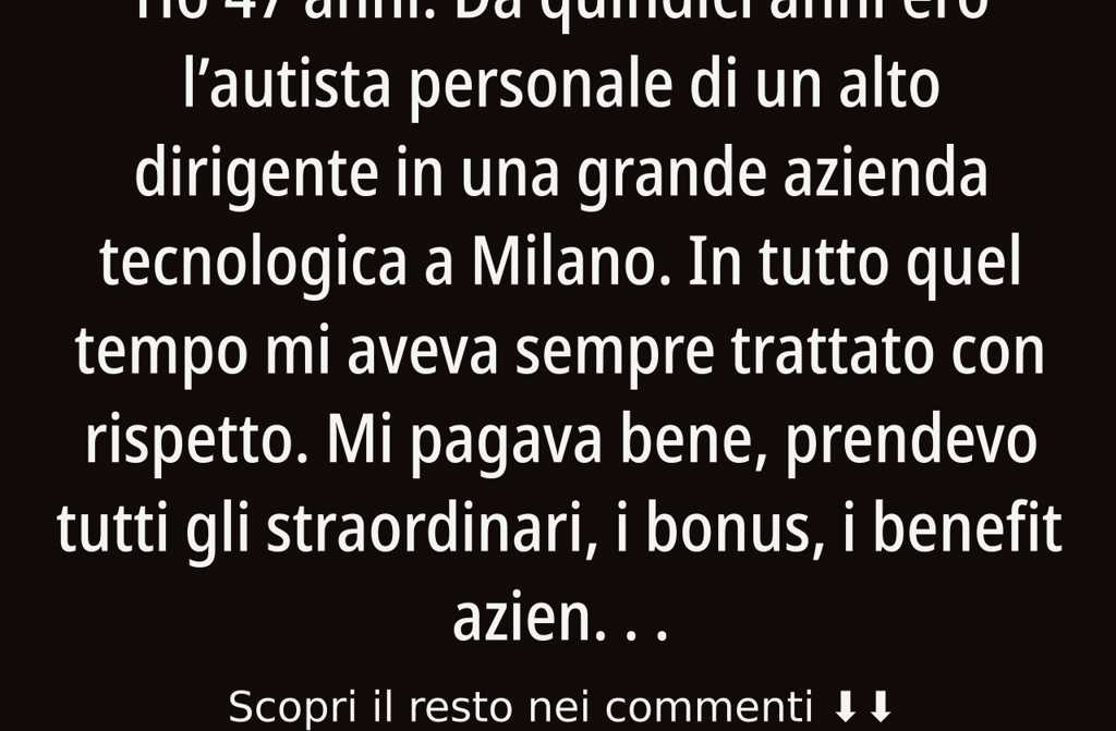Ho 47 anni. Da quindici anni ero lautista personale di un alto dirigente in una grande azienda tecnologica a Milano. In tutto quel tempo mi aveva sempre trattato con rispetto. Mi pagava bene, prendevo tutti gli straordinari, i bonus, i benefit aziendali, persino qualche gratifica extra. Lo accompagnavo ovunque a riunioni, allaeroporto, a cene di lavoro e ad eventi familiari.