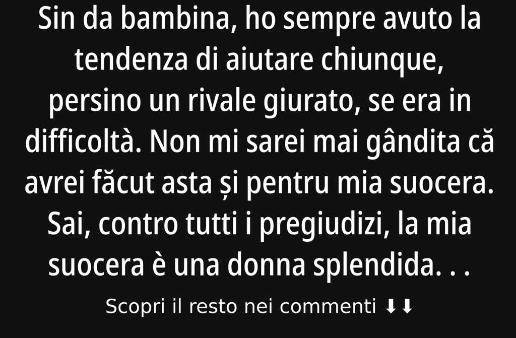 Sin da bambina, ho sempre avuto la tendenza di aiutare chiunque, persino un rivale giurato, se era in difficoltà. Non mi sarei mai gândita că avrei făcut asta și pentru mia suocera. Sai, contro tutti i pregiudizi, la mia suocera è una donna splendida, gentile ed estremamente educata. Qualche settimana fa, sfortunatamente, ha avuto un brutto colpo: si è ammalata seriamente, è finita in ospedale e ha avuto bisogno di tempo per riprendersi anche dopo essere stata dimessa.