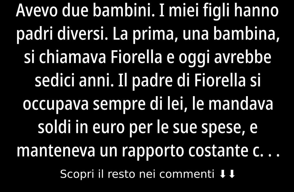 Avevo due bambini. I miei figli hanno padri diversi. La prima, una bambina, si chiamava Fiorella e oggi avrebbe sedici anni. Il padre di Fiorella si occupava sempre di lei, le mandava soldi in euro per le sue spese, e manteneva un rapporto costante con la figlia. Sebbene il mio primo marito si fosse risposato e avesse avuto altri due figli dalla seconda moglie, non si dimenticava mai di Fiorella.