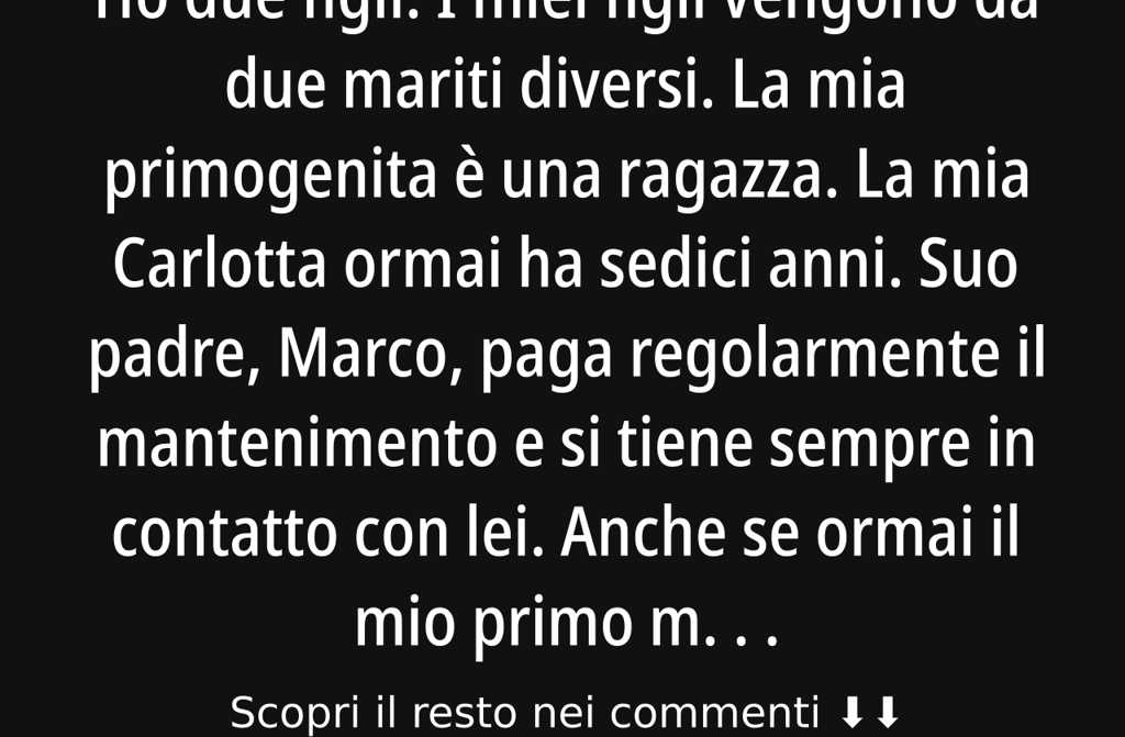 Ho due figli. I miei figli vengono da due mariti diversi. La mia primogenita è una ragazza. La mia Carlotta ormai ha sedici anni. Suo padre, Marco, paga regolarmente il mantenimento e si tiene sempre in contatto con lei. Anche se ormai il mio primo marito si è risposato e ha fatto altri due figli con la seconda moglie, non si scorda mai della nostra Carlotta.