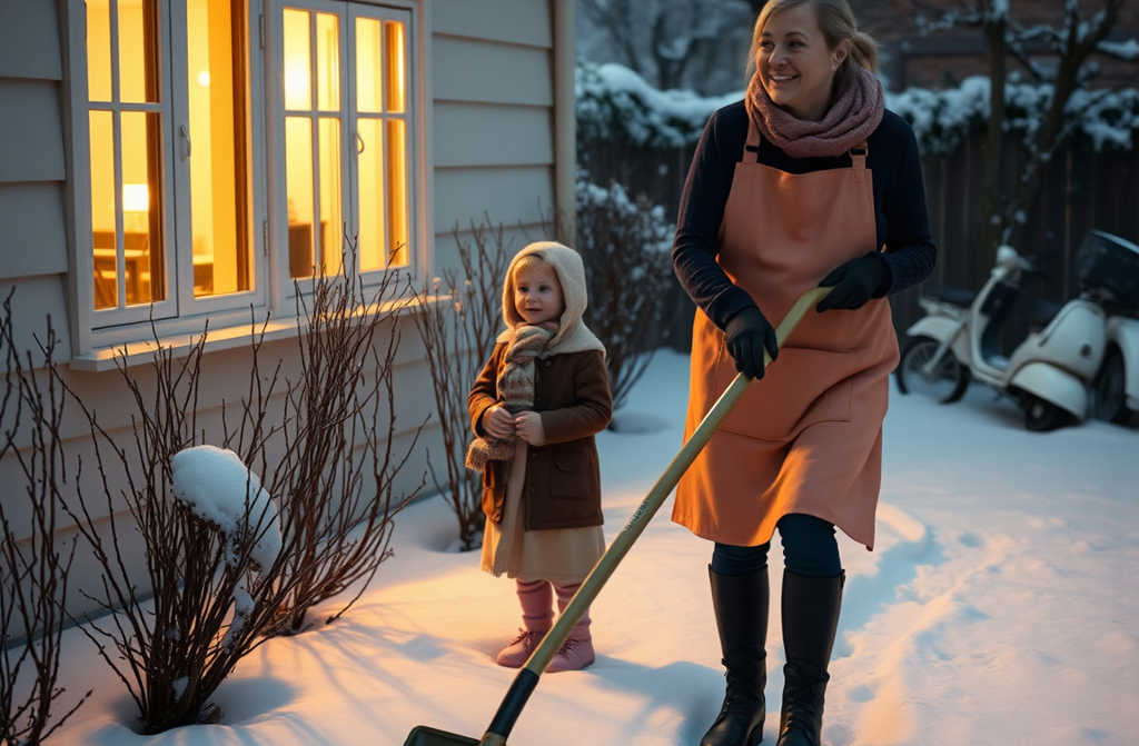 Pulisce tutto con precisione: dal cancello al portone, una striscia netta e perfetta. Raccoglie la neve vicino ai muri, come le piaceva.