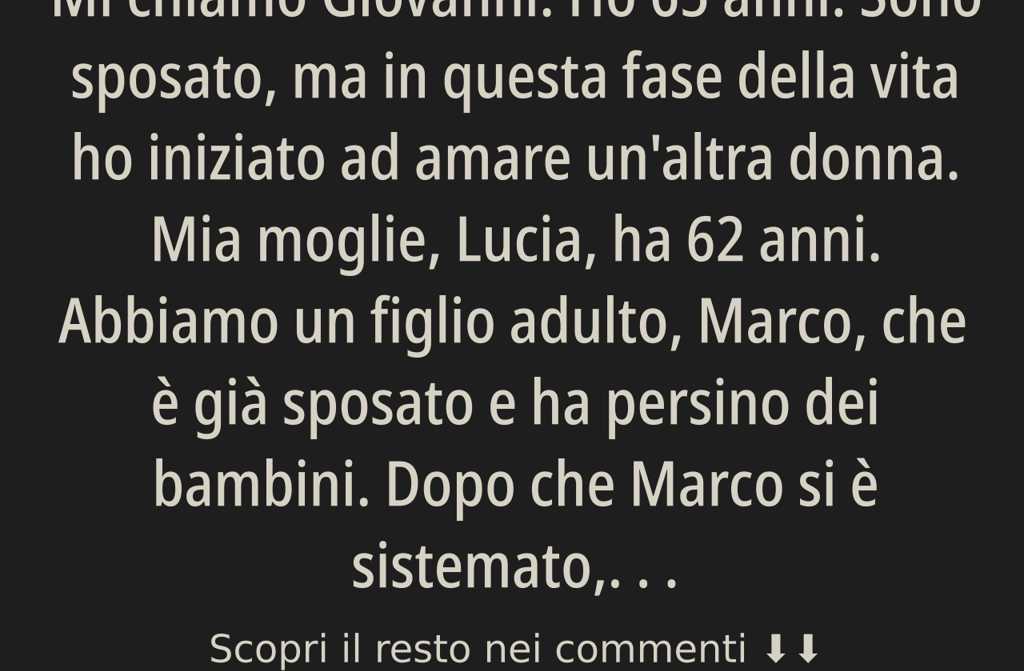 Mi chiamo Giovanni. Ho 65 anni. Sono sposato, ma in questa fase della vita ho iniziato ad amare un’altra donna. Mia moglie, Lucia, ha 62 anni. Abbiamo un figlio adulto, Marco, che è già sposato e ha persino dei bambini. Dopo che Marco si è sistemato, mi sono accorto che tra me e Lucia era calato il gelo.