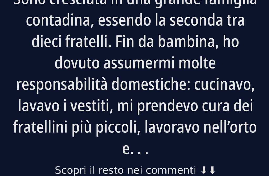 Sono cresciuta in una grande famiglia contadina, essendo la seconda tra dieci fratelli. Fin da bambina, ho dovuto assumermi molte responsabilità domestiche: cucinavo, lavavo i vestiti, mi prendevo cura dei fratellini più piccoli, lavoravo nellorto e accudivo gli animali in stalla. Ero spesso esausta per tutto quel lavoro e non di rado mi addormentavo appena poggiata sul cuscino. Raggiunta la maggiore età, i miei genitori hanno iniziato a insistere affinché mi sposassi, vedendomi come una bocca in più da sfamare e pensando che fosse giunto il momento di trovare marito.
