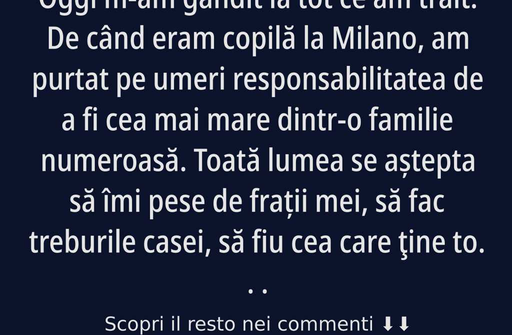 Oggi m-am gândit la tot ce am trăit. De când eram copilă la Milano, am purtat pe umeri responsabilitatea de a fi cea mai mare dintr-o familie numeroasă. Toată lumea se aștepta să îmi pese de frații mei, să fac treburile casei, să fiu cea care ţine totul în ordine. N-a fost o alegere a mea, ci o obligaţie impusă și acceptată cu amar. În cartier și la școală, copiii mă porecleau mereu mamma della banda doar pentru că eram înconjurată de cei mici. Plângeam deseori pe ascuns, promițându-mi că nu voi avea niciodată copii, că nu voi repeta povestea asta.