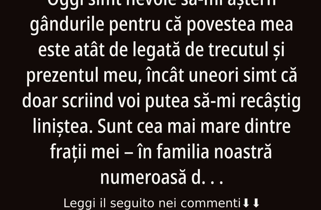 Oggi simt nevoie să-mi aștern gândurile pentru că povestea mea este atât de legată de trecutul și prezentul meu, încât uneori simt că doar scriind voi putea să-mi recâștig liniștea. Sunt cea mai mare dintre frații mei în familia noastră numeroasă din Napoli, aceasta a fost mereu o povară. Mi s-a cerut să am grijă de cei mici, să fac tot ce era nevoie acasă, fără dreptul de a alege. Niciodată nu am fost întrebată ce-mi doresc. Multe zile mi-au fost marcate de privirile curioase ale vecinilor și colegilor de școală, care mereu mă ironizau pentru că eram mereu cu frații mei după mine. Îmi promiteam în tăcere, printre lacrimi, că nu voi avea copii, că nu voi repeta aceeași poveste.