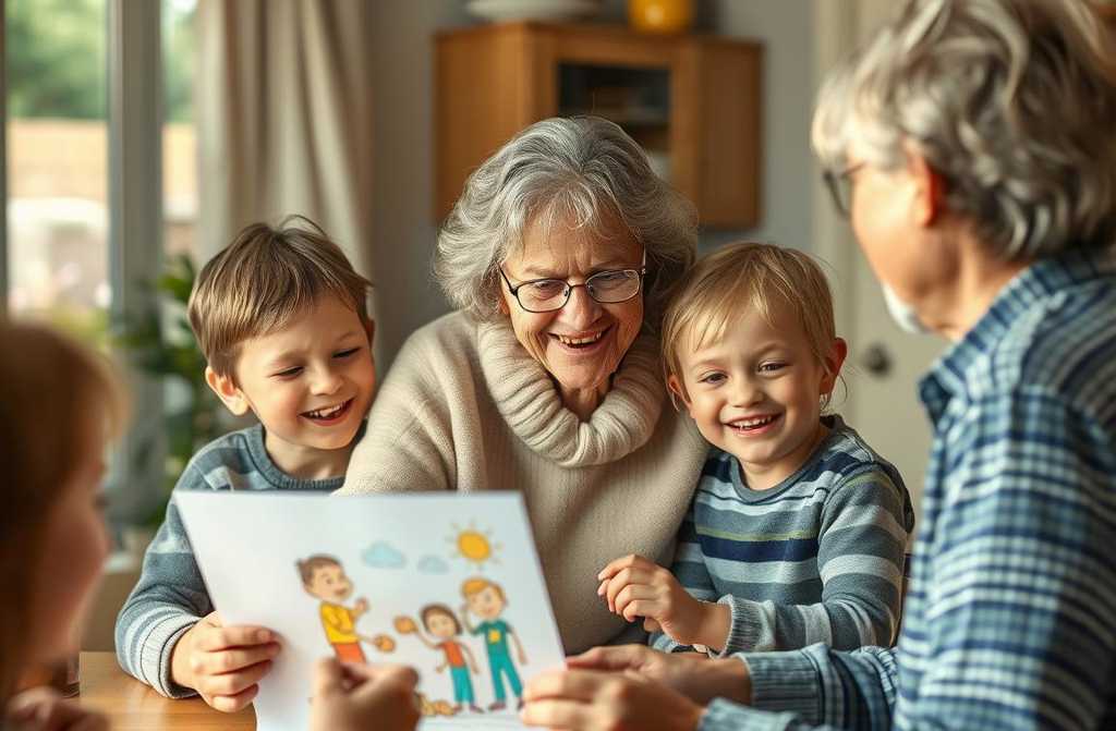 Oh, nonna, lasciami! Bianca scende dalle ginocchia della nonna e tira fuori dalla borsa della mamma un foglio Guarda, lho disegnato a scuola! Questa sei tu, questo è il nonno, questa è la mamma, il papà, Sofia, Carlo e io! È per te e il nonno. La nostra famiglia grande! Ti piace?