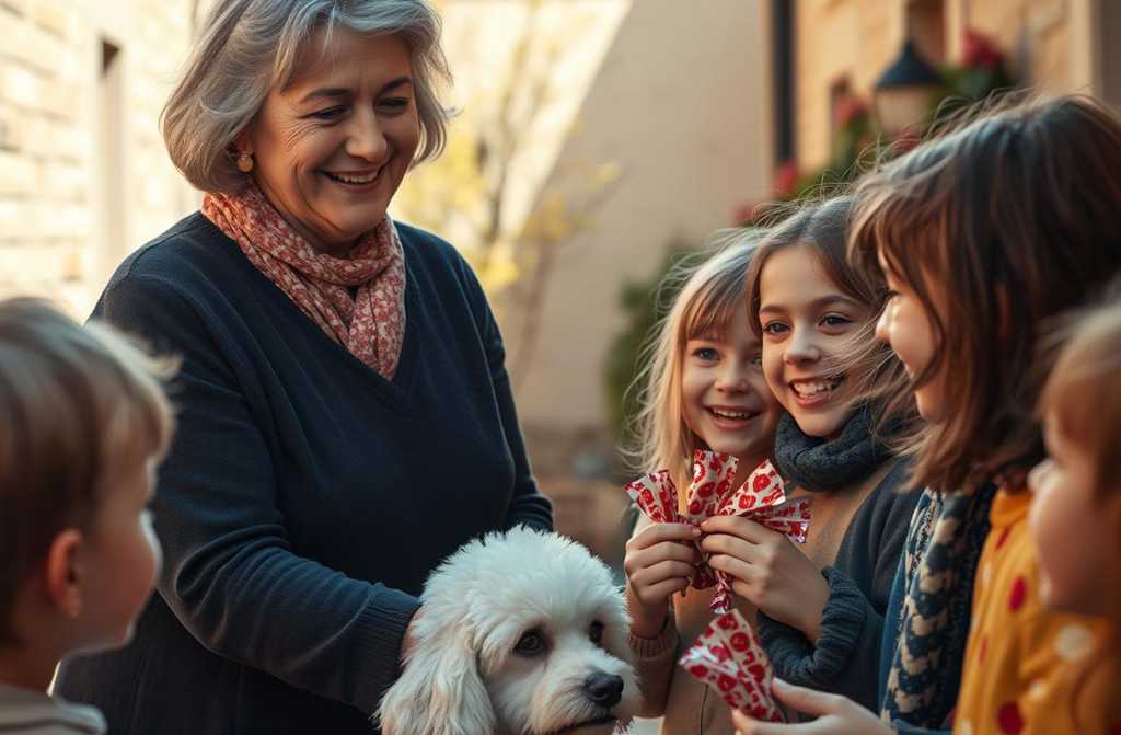 Il giorno dopo, otto di noi (quattro ragazze e quattro ragazzi) ci radunammo e andammo alla sua casa con doni fatti con le nostre mani. Cesare dipinse il cielo e il sole; Marco portò il suo pennarello preferito; Gianna e Domenico modellarono con la plastilina un piccolo gnomo; Olivetta portò un fiore in vaso; i gemelli Marta e Paolo portarono marmellata; e io, con le mani di mia madre, preparai delle frittelle sottili, leggere come nuvole, servite con burro fuso. La mamma mi sgridò per non dimenticare di portarle.