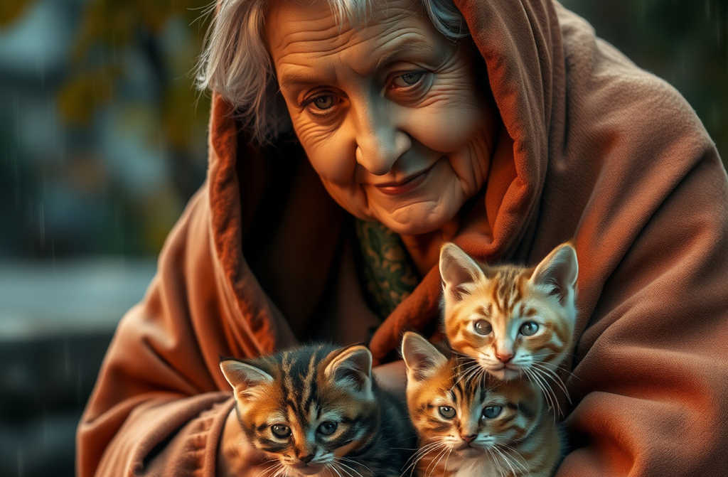Fu la vecchia scontrosa del primo piano a cedere per prima. Uscì sotto la pioggia fredda, in vestaglia, e si mise a sbraitare contro il mondo intero. Prese i gattini, strinse Peppina a sé, e disse a Corgi: