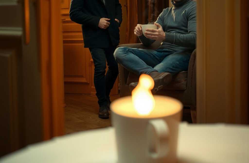 Entrano in salotto. Antonio va dritto verso il tavolino, visibilmente impaziente di scaldarsi. Si lascia cadere nella poltrona morbida, afferra la tazza a due mani e ne assapora il calore; chiude gli occhi un istante, lasciando che la sensazione di conforto si diffonda dentro di lui.