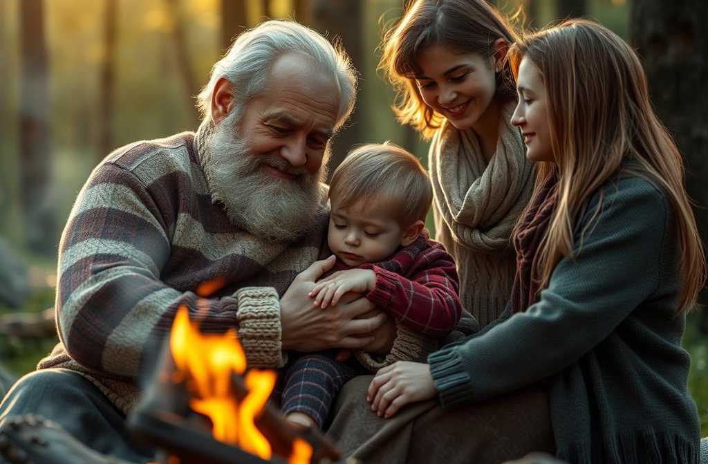 Raccoglie rami di pino, li porta al fuoco e li avvolge attorno al nonno.