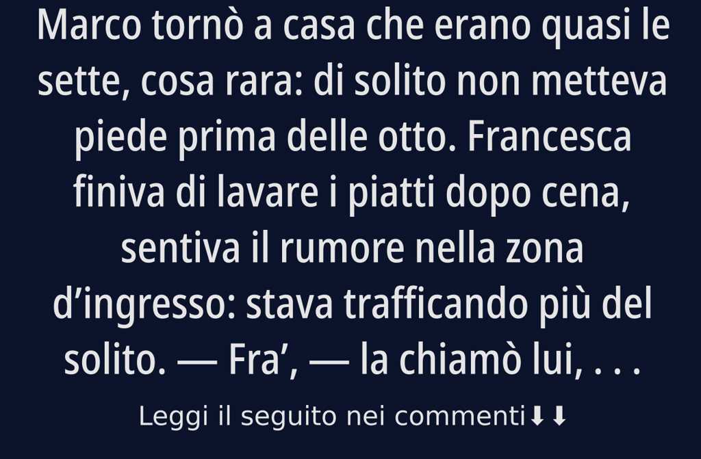 Marco tornò a casa che erano quasi le sette, cosa rara: di solito non metteva piede prima delle otto. Francesca finiva di lavare i piatti dopo cena, sentiva il rumore nella zona dingresso: stava trafficando più del solito.