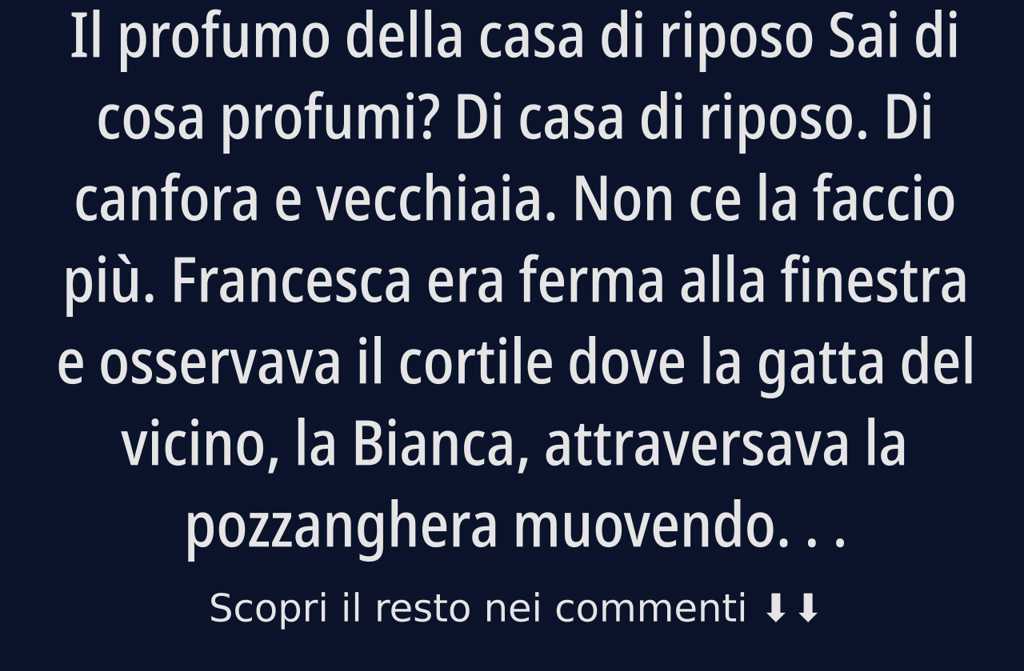 Cinque anni prima, Lucia era stata colta da ictus proprio a tavola, durante il compleanno di Giorgio. Lei aveva preparato una crostata alle ciliegie, Lucia aveva detto buona, poi aveva lasciato cadere la forchetta e guardato Francesca con uno sguardo indecifrabile. Aveva capito subito. Aveva chiamato lambulanza, era salita assieme, stringendo la mano che ormai non poteva più rispondere.