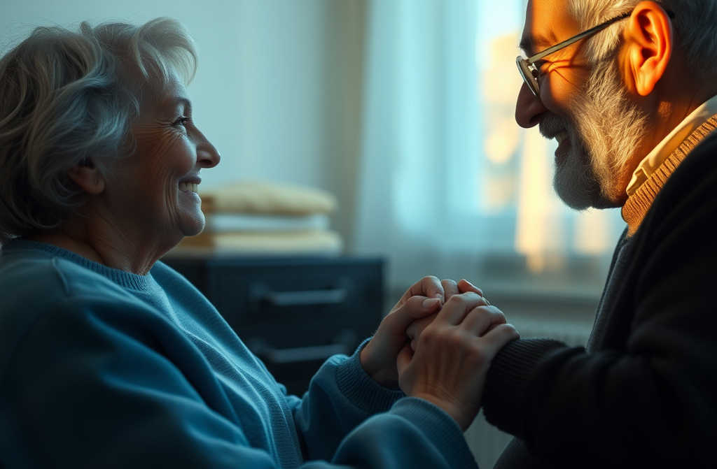 Il vecchio aprì piano gli occhi e guardò la moglie invecchiata accanto a lui. Il suo volto una volta bellissimo era ora segnato da una ragnatela di rughe, le spalle curve e laria dignitosa di una volta si era persa. Lei, senza mai lasciargli la mano, sistemò il deflussore della flebo sul suo braccio e sorrise.