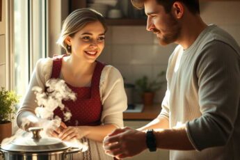 Lorenzo lancia unocchiata a Giulia, che sta versando la zuppa.