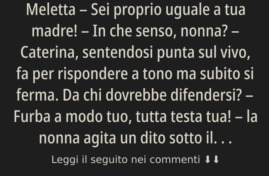 Tua madre è tanto fiera di te, lo sai? E anchio. Sei una vera melettaCaterina sente il calore di quella carezza arrivare fin dentro il cuore, come quando la mamma la stringeva forte e il mondo si sistemava. Sorridendo tra le lacrime, guarda la nonna che si allontana spingendo il passeggino con Samuele, la voce tonante che richiama attenzione tra la folla stupita.