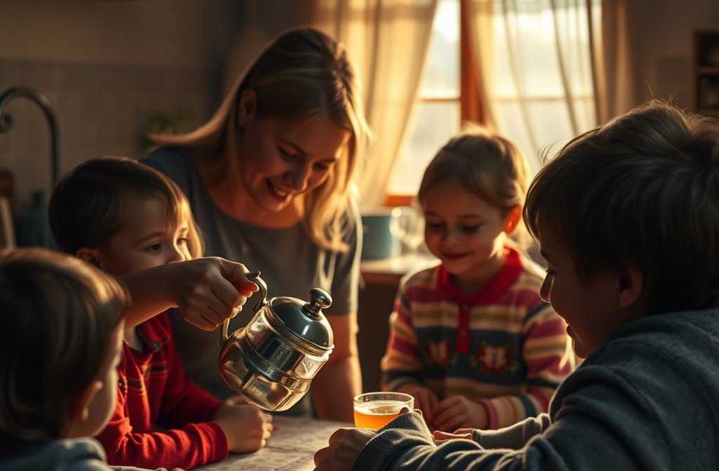 Laura lo invita a sedersi, gli serve il tè. I bambini lo osservano curiosi.