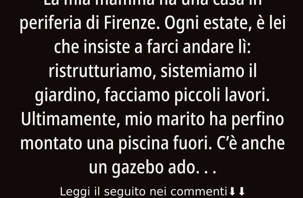 La mia mamma ha una casa in periferia di Firenze. Ogni estate, è lei che insiste a farci andare lì: ristrutturiamo, sistemiamo il giardino, facciamo piccoli lavori. Ultimamente, mio marito ha perfino montato una piscina fuori. Cè anche un gazebo adorabile. Da quando mio fratello si è sposato, però, non è più venuto; sua moglie, Isabella, non vuole saperne. Isabella è stata chiara: ora lui deve mettere lei e la sua famiglia prima di tutto. Se serve qualcosa alla mamma, che si trovi dei lavoratori.