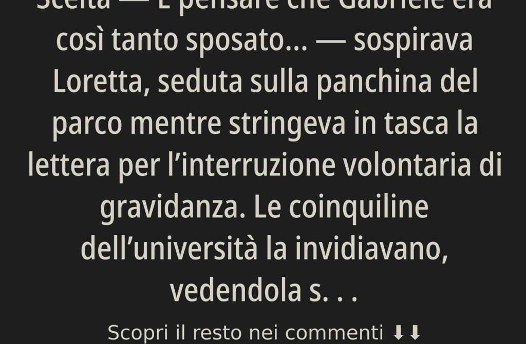 E pensare che Gabriele era così tanto sposato sospirava Loretta, seduta sulla panchina del parco mentre stringeva in tasca la lettera per linterruzione volontaria di gravidanza.