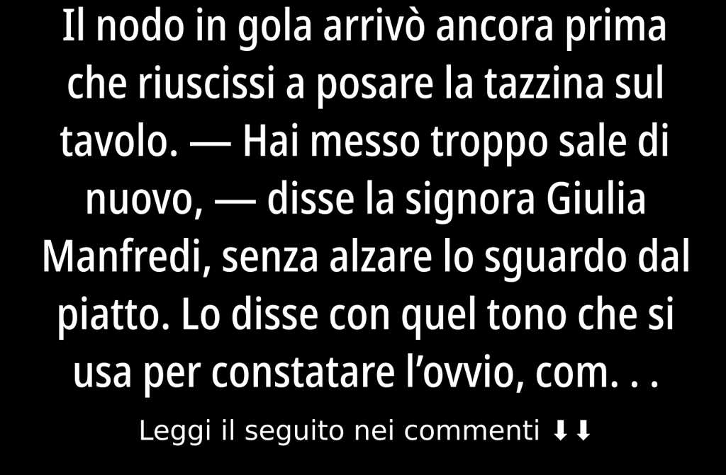 Hai messo troppo sale di nuovo, disse la signora Giulia Manfredi, senza alzare lo sguardo dal piatto. Lo disse con quel tono che si usa per constatare lovvio, come quando si commenta il tempo che cambia.