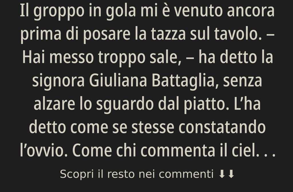 Hai messo troppo sale, ha detto la signora Giuliana Battaglia, senza alzare lo sguardo dal piatto. Lha detto come se stesse constatando lovvio. Come chi commenta il cielo nuvoloso fuori.