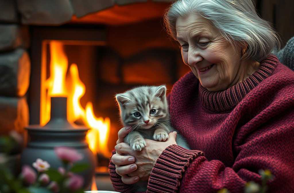 Il gattino si accoccolò al suo petto. Improvvisamente cominciò a piovere, e il vecchio camino di pietra della nonna, carico di legna secca, scricchiolò allegro sotto il fruscio della pioggia.