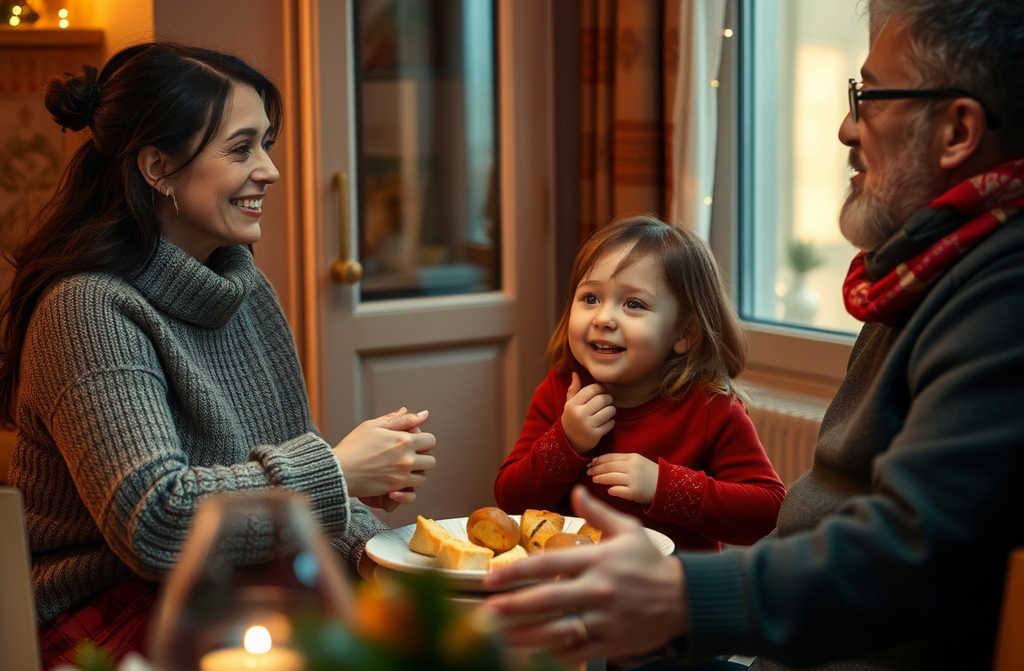 La signora Assunta, già in clima di festa, si infila in casa guardando il nostro tavolo con solo le patate al centro e poi se ne va senza dire una parola. Dopo una ventina di minuti, sentiamo bussare ancora più forte; questa volta la mamma va ad aprire da sola. Entra la signora Assunta con le braccia cariche di buste e scatole. Da sotto il braccio le spunta una bottiglia di spumante e inizia a tirare fuori insalate, affettati, un barattolo di cetriolini sottaceto, mezzo pollo lesso, dolcetti e perfino qualche mandarino.