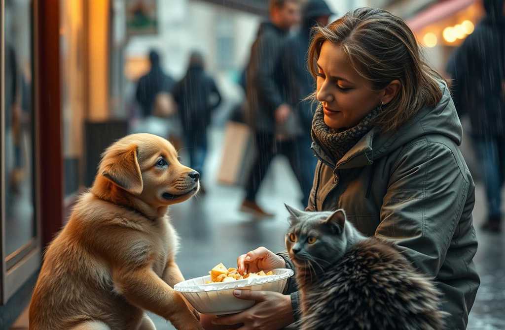 Il giorno dopo, portò loro del cibo. Nel cuore, sperava di trovarli ancora lì. E cerano. La gatta miagolò felice, il cucciolo scodinzolò. Da allora, ogni mattina lasciò qualcosa per loro, e anche la sera, prima di tornare a casa.