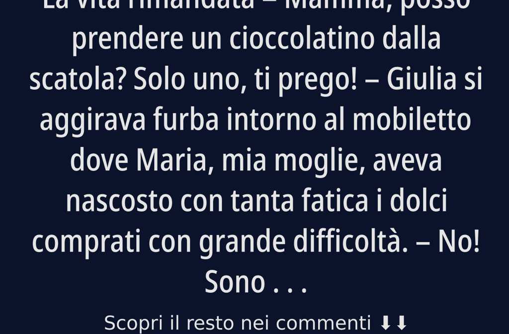 Mamma, posso prendere un cioccolatino dalla scatola? Solo uno, ti prego! Giulia si aggirava furba intorno al mobiletto dove Maria, mia moglie, aveva nascosto con tanta fatica i dolci comprati con grande difficoltà.