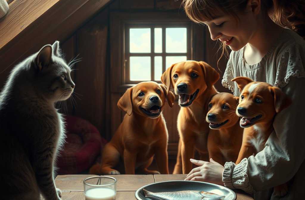 Il gatto, stanco di correre, resta vicino al piatto. Giulia, senza badare a lui, dà da mangiare ai cuccioli e al Ciro. Micio, curioso, osserva. Giulia, accorgendosi che non scappa, porge altri pezzetti accanto al suo cibo: