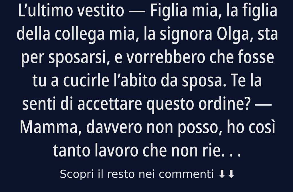 Mi cuciresti un vestito, ti prego? Non sono riuscita a sposarmi in questa vita, ma almeno voglio andarmene con labito che desidero sarà il mio ultimo vestito. Io e Andrea staremo insieme adesso, per sempre. Era scritto così, non labbiamo scelto noi