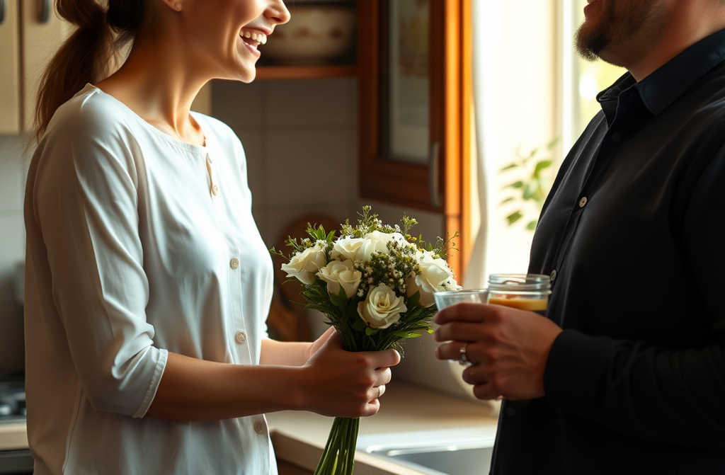 Il giorno dopo, Antonio appare alla porta con un modesto mazzo di fiori.